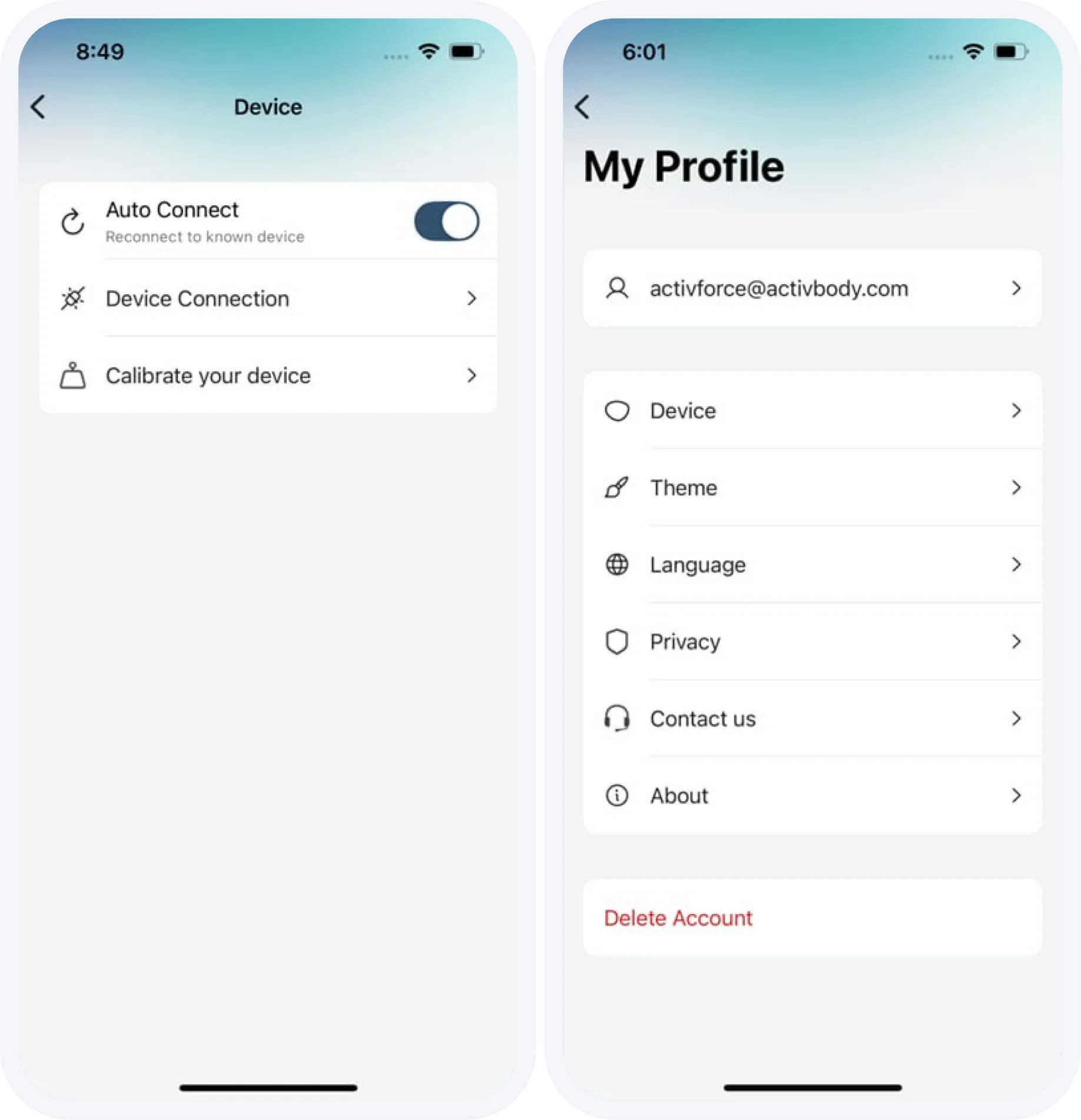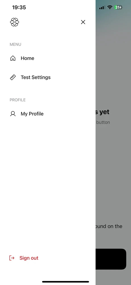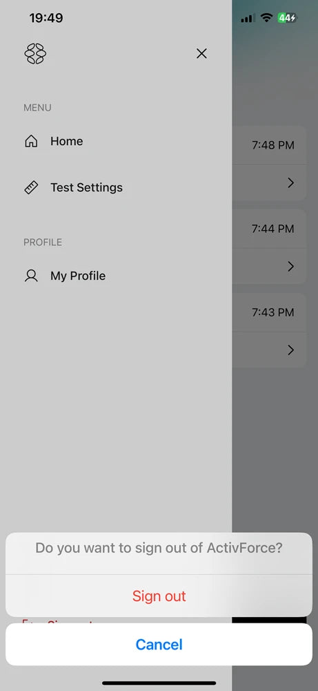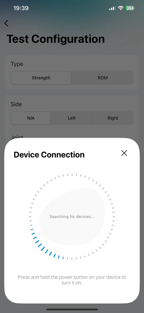 In the ActivForce app, start a measurement or select “Device Connection” in the “My Profile” screen, which can be found by opening the sidebar menu. A list of available devices will be shown in the app under “Available Devices”. Tap on the device name that corresponds to your ActivForce 2 device.