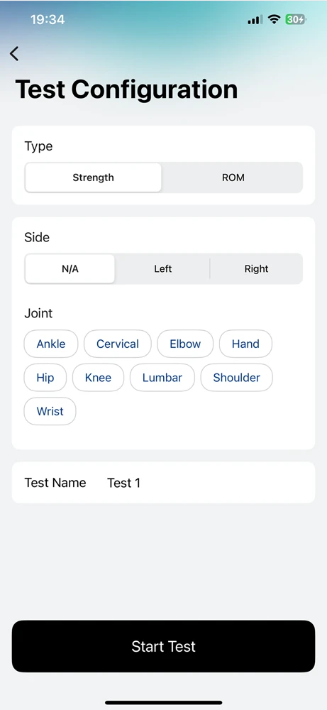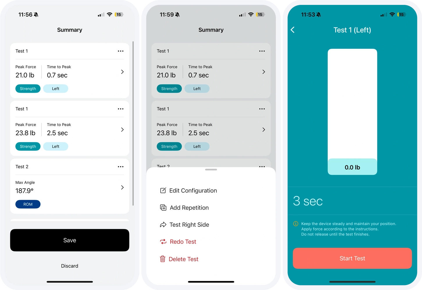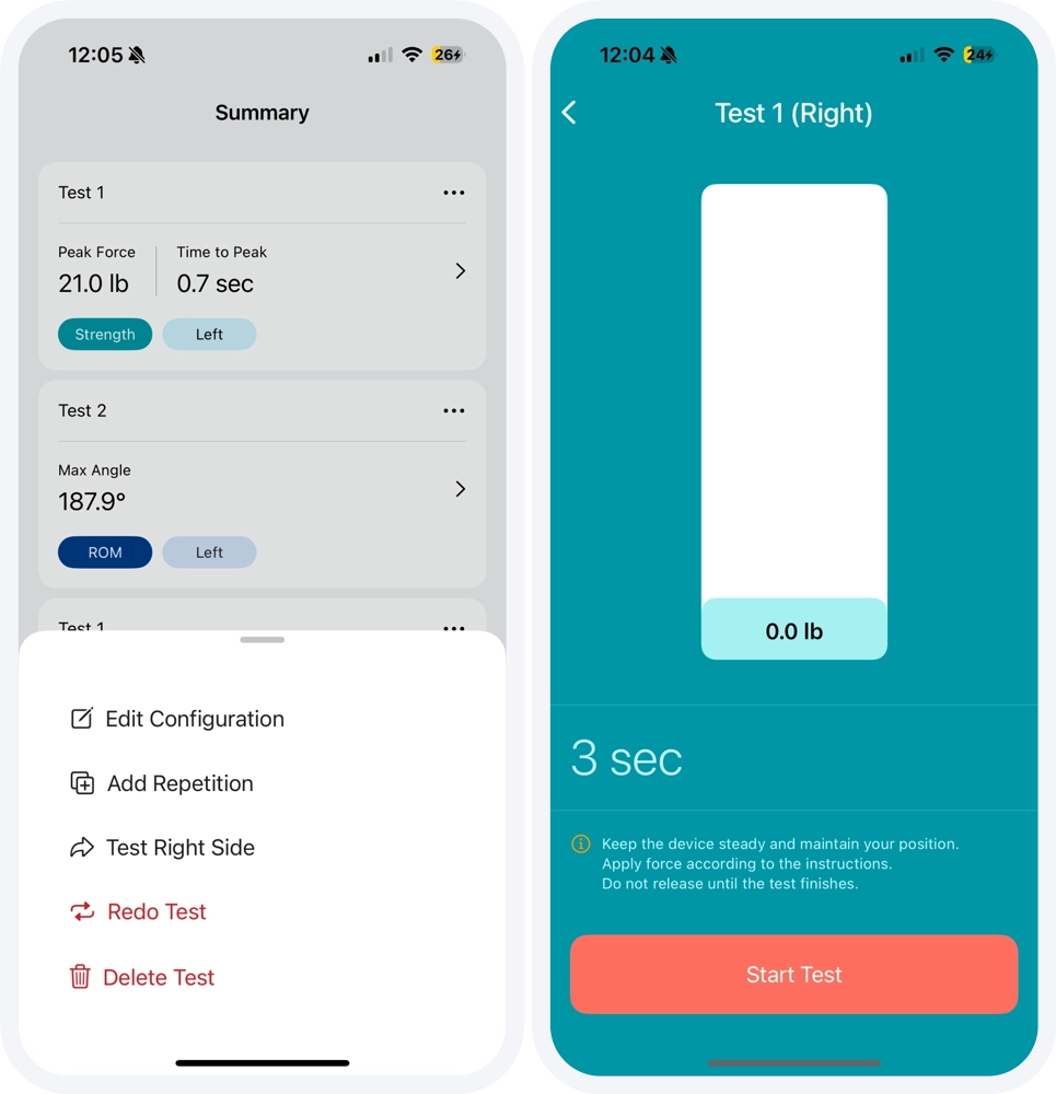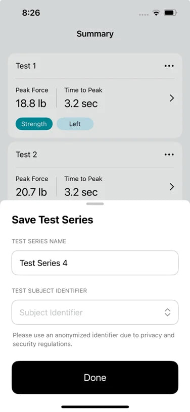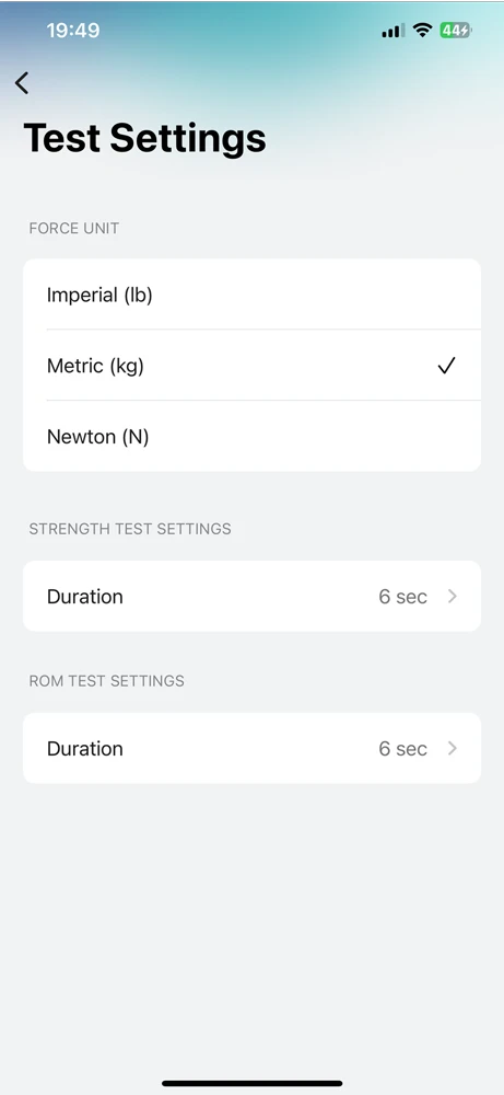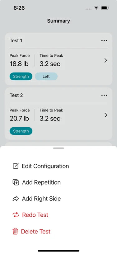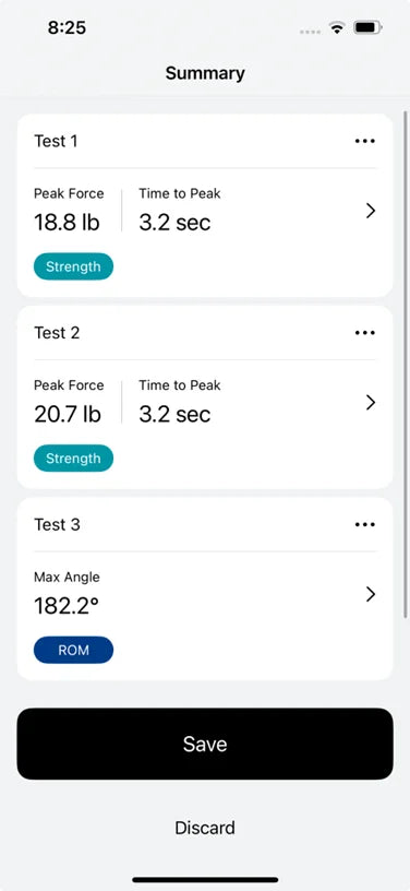 a. Force Measurements: Strength tests with left, right and N/A side options that report measurements in pounds, kilograms, or Newtons.