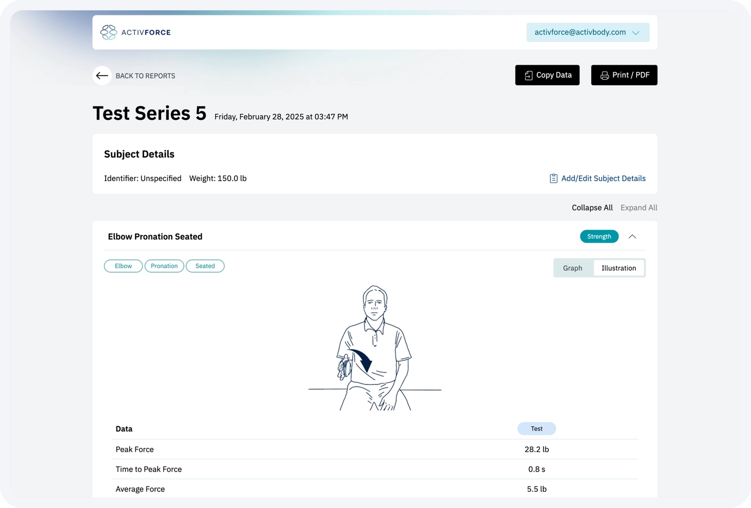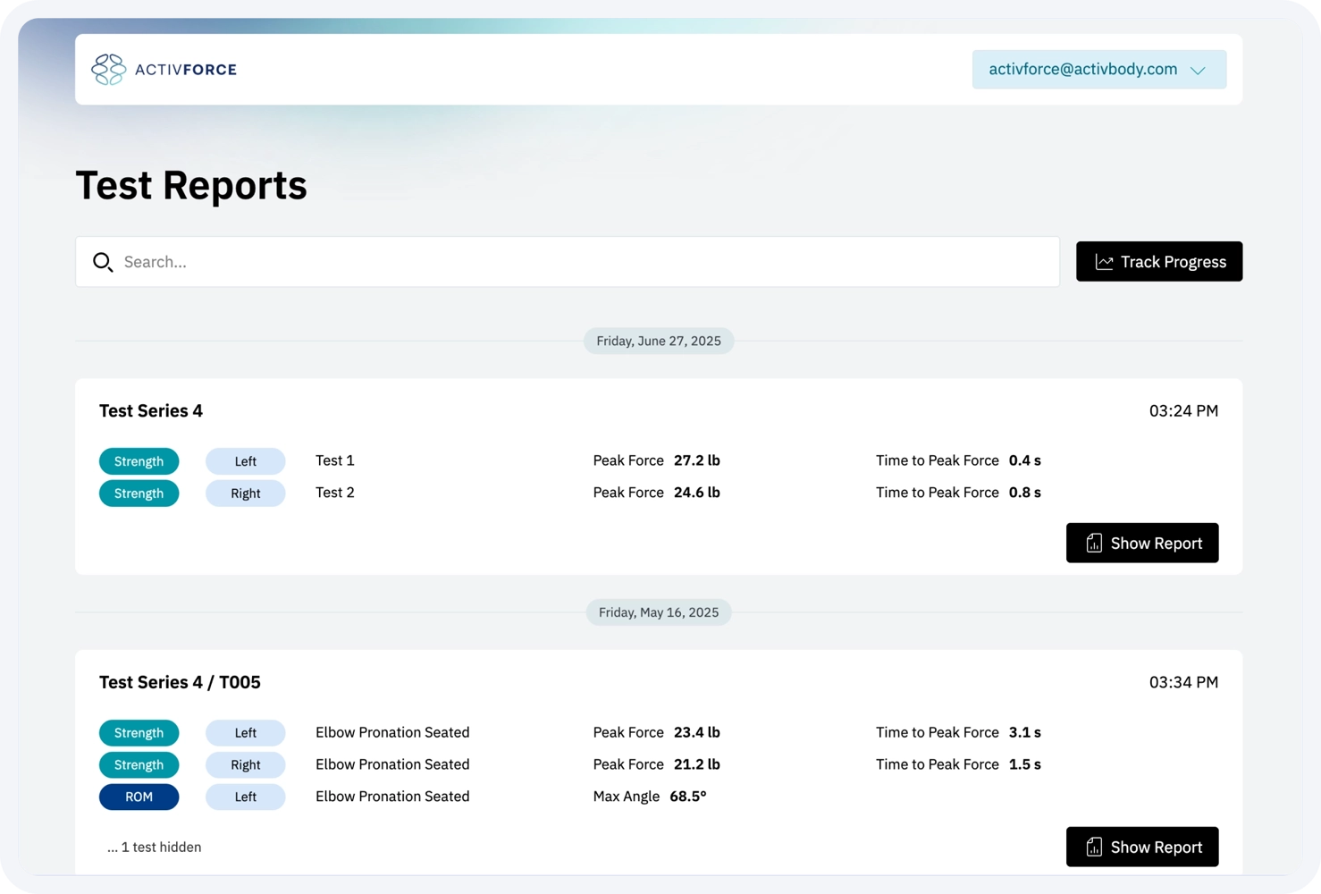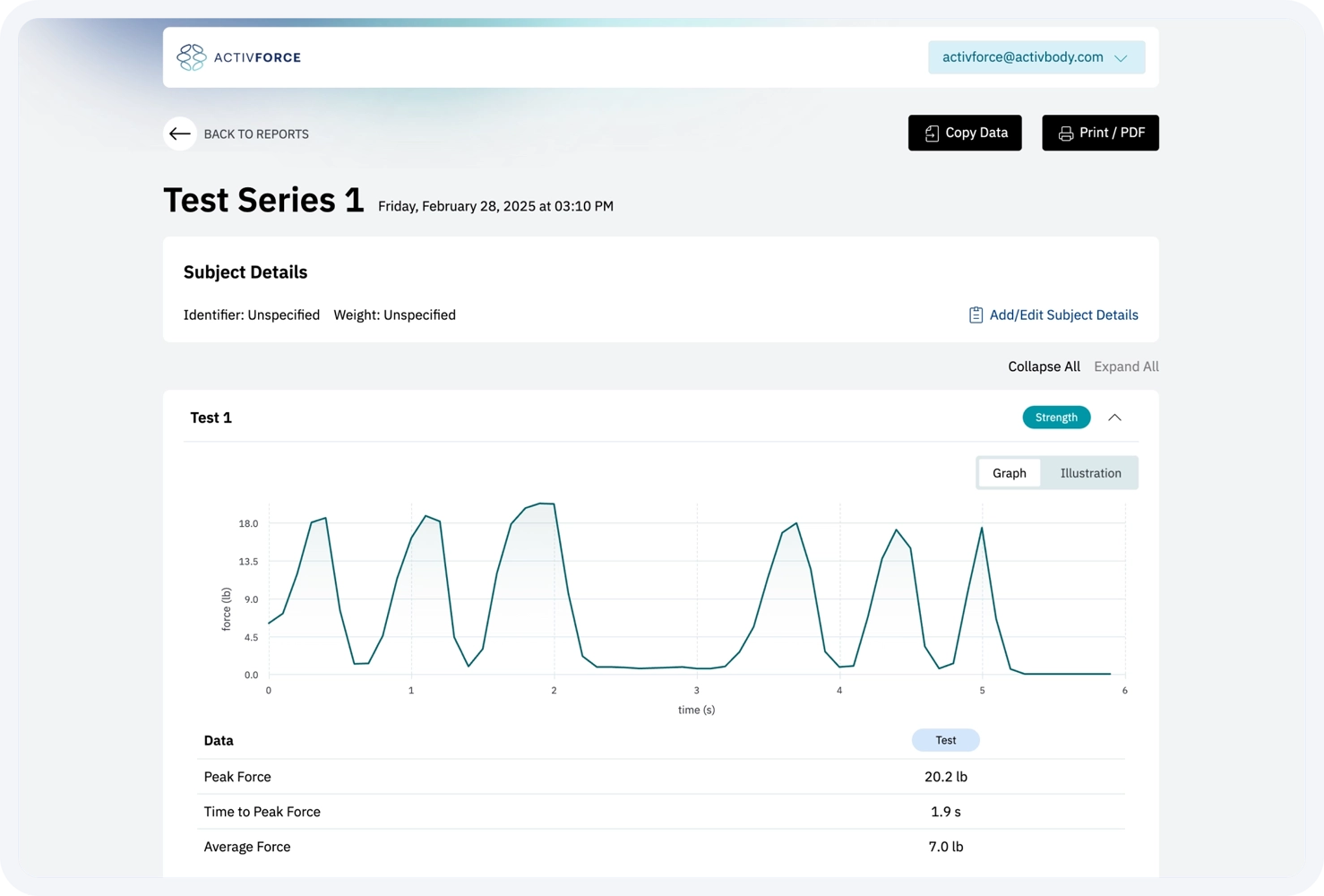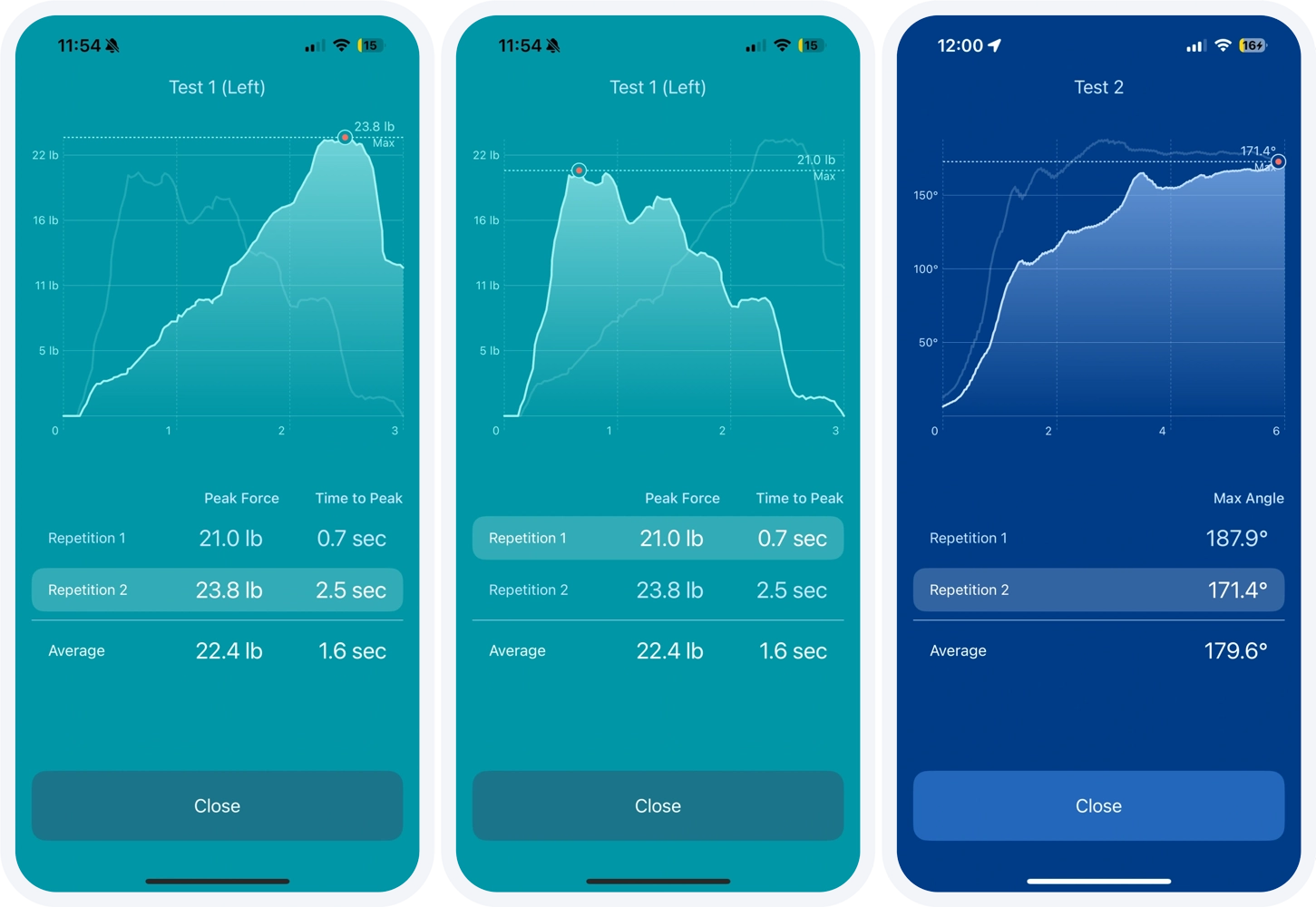 a. Force Measurements: Strength tests with left, right and N/A side options that report measurements in pounds, kilograms, or Newtons.
