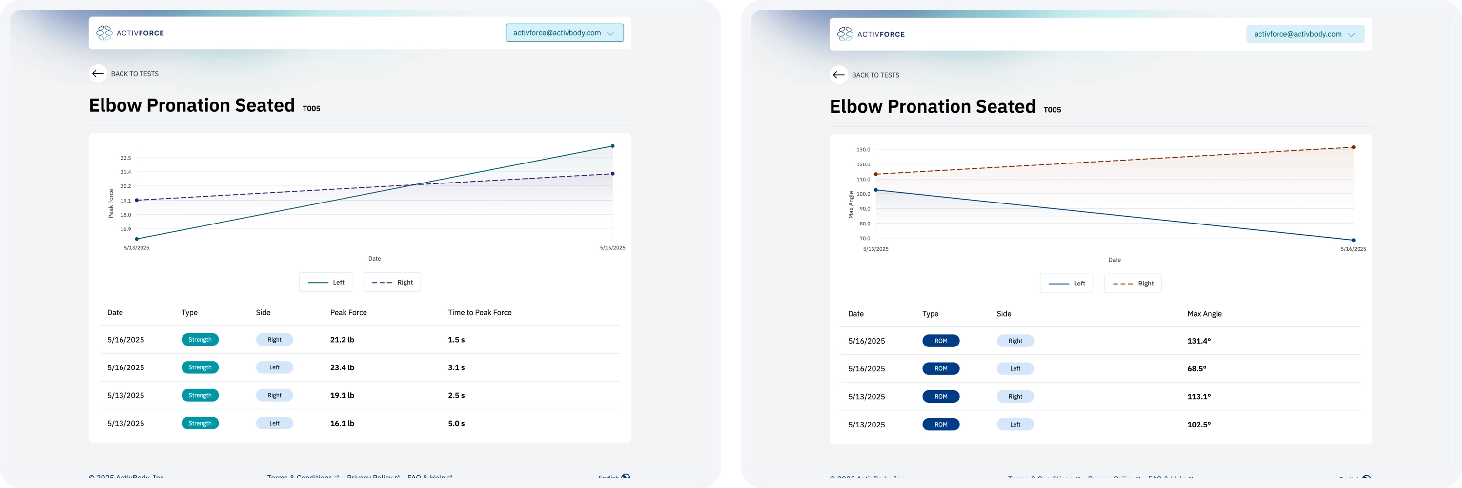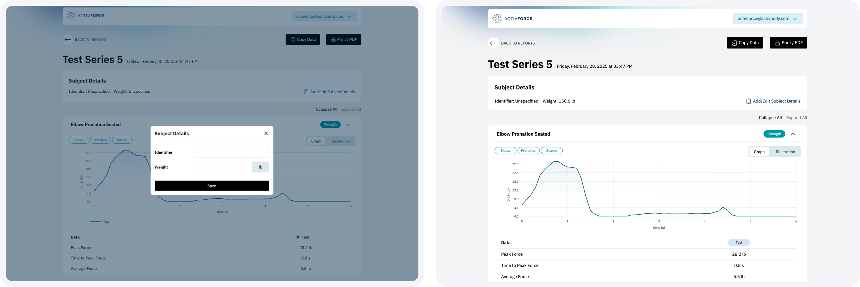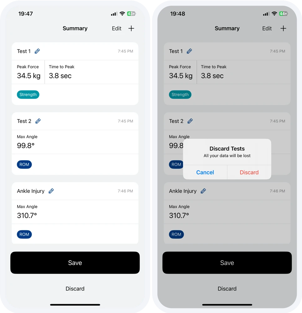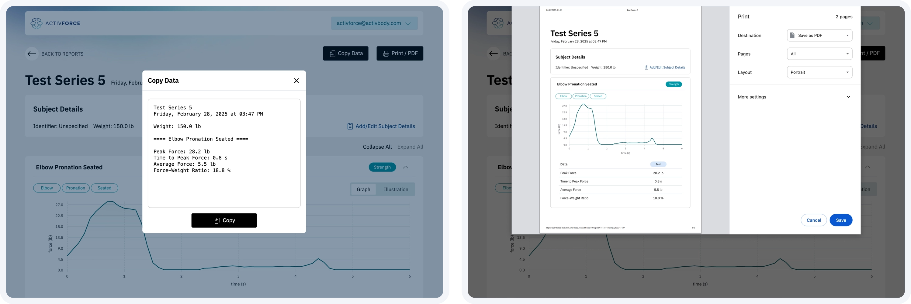 a. Force Measurements: Strength tests with left, right and N/A side options that report measurements in pounds, kilograms, or Newtons.